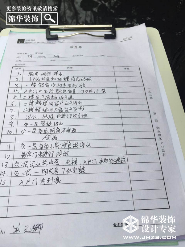 本次驗(yàn)房,我們的工作人員針對(duì)房屋的水電,墻面,頂面,地面進(jìn)行了詳細(xì)的檢查,并給出書面報(bào)告,為業(yè)主提供專業(yè)的房屋問(wèn)題解決方案和建議。希望讓廣大富力業(yè)主在裝修前把房屋問(wèn)題全面解決