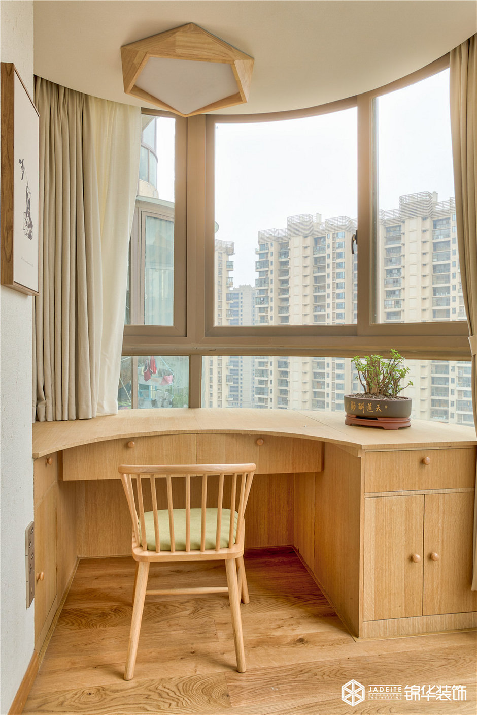 ▲陽臺(tái)制作了擱架書桌,業(yè)主偶爾回家時(shí),在臥室也能滿足看書或辦公的需要!