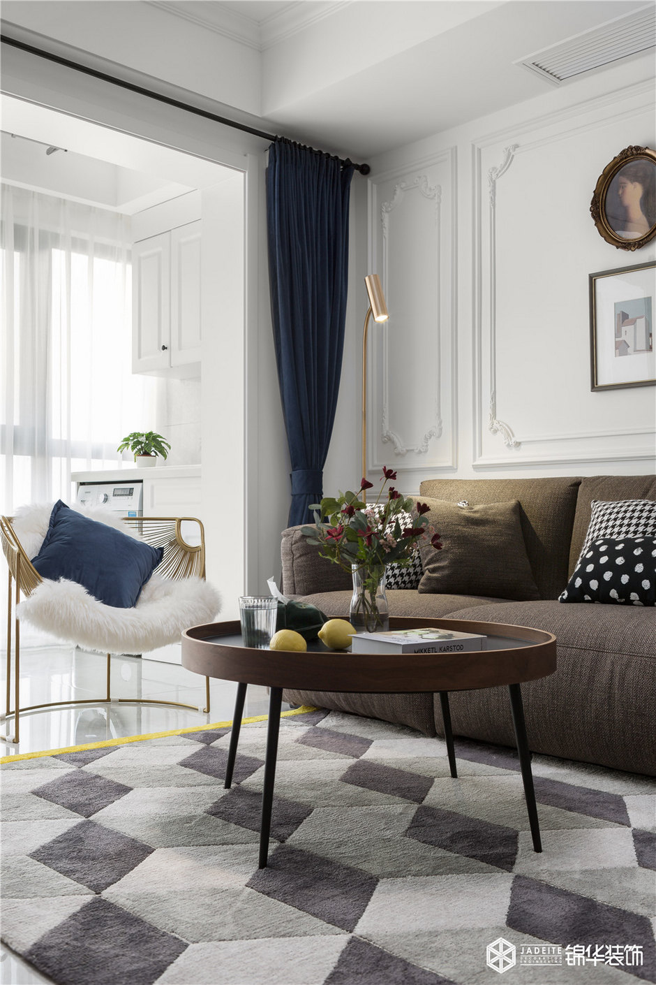 將陽臺(tái)空間納入室內(nèi),但因?yàn)樵柵_(tái)的梁無法拆除,如果將其全部遮蓋,客廳的整體高度會(huì)降低,設(shè)計(jì)師機(jī)智地做了一個(gè)美式經(jīng)典的格子頂,美觀實(shí)用,然后加已線條做出層次使客廳空間看起來高挑。