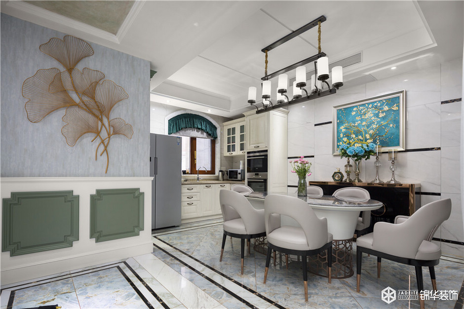 靠近餐廳的墻上,采用了別致的銀杏葉掛件,既富有文藝氣息(符合業(yè)主本身的文藝調(diào)性),又律動感十足,讓人移不開眼。