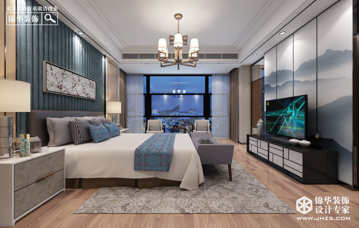 主臥并沒有因為自己是主人而特立獨行,它將藍(lán)色的主色調(diào)進(jìn)行到底,主臥與衣帽間之間采用定制的中式水墨畫作為隔斷,門采用的是麻紗設(shè)計,讓整個空間既統(tǒng)一,又更加通透。