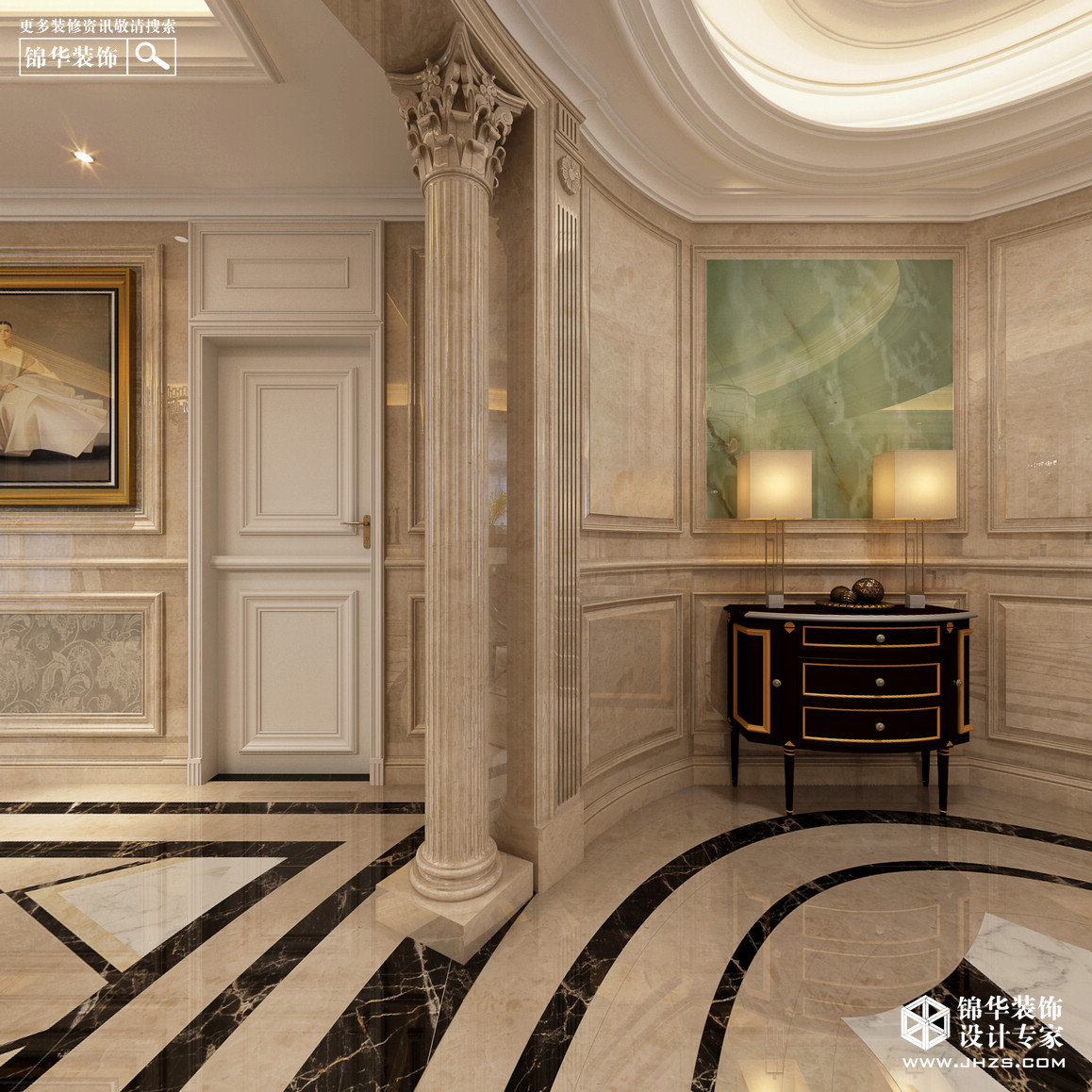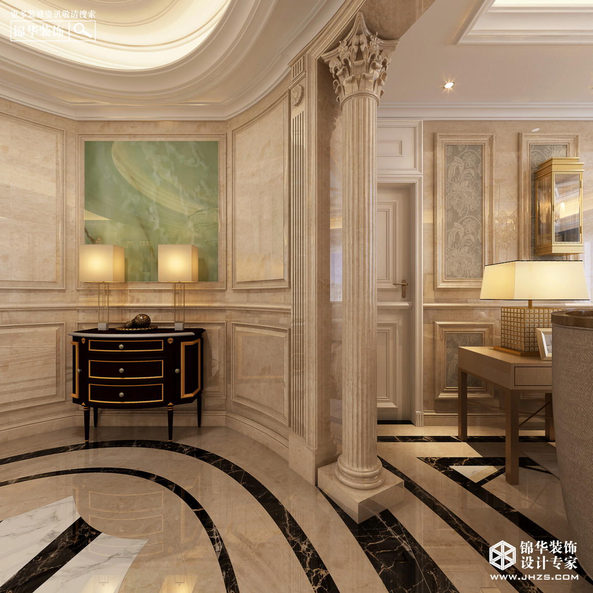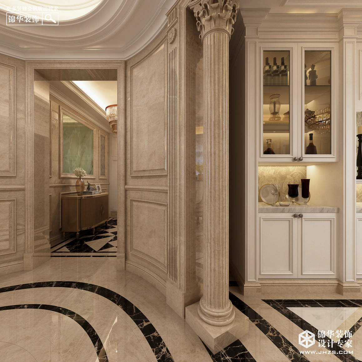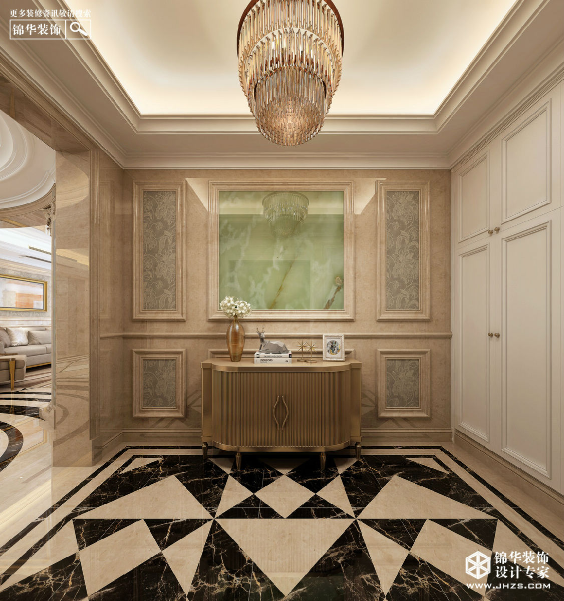 玄關(guān):玄關(guān)處采用異形設(shè)計(jì),玉石墻面搭配矮柜和精美裝飾物,使得門廳具有層次感,帶來欣賞性極強(qiáng)的視覺效果,并具有一種歐式的典雅與尊貴感。